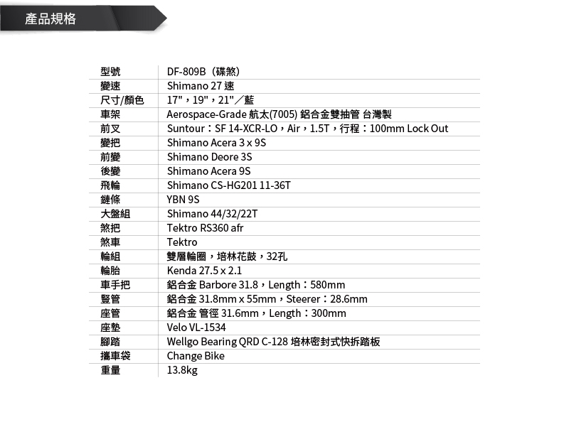商品詳細介紹 體驗說明 不可體驗 使用方法說明 請詳盡閱讀操作手冊 注意事項 由於自行車商品體積大,運費高,為提供您最優質的價格與服務,避免來回運送造成商品刮傷及雙方的不便,本商品一旦出貨後恕不接受退訂,下單前請消費者慎思,感謝您的配合。 本商品為90%組裝其餘10%為前輪快拆、車把、座管、踏板。如組裝不熟悉,請勿強行組裝,可與貨運單上之出貨商聯絡組裝事宜。因電腦螢幕略有色差,商品圖片皆為參考,出貨以實際商品為準!