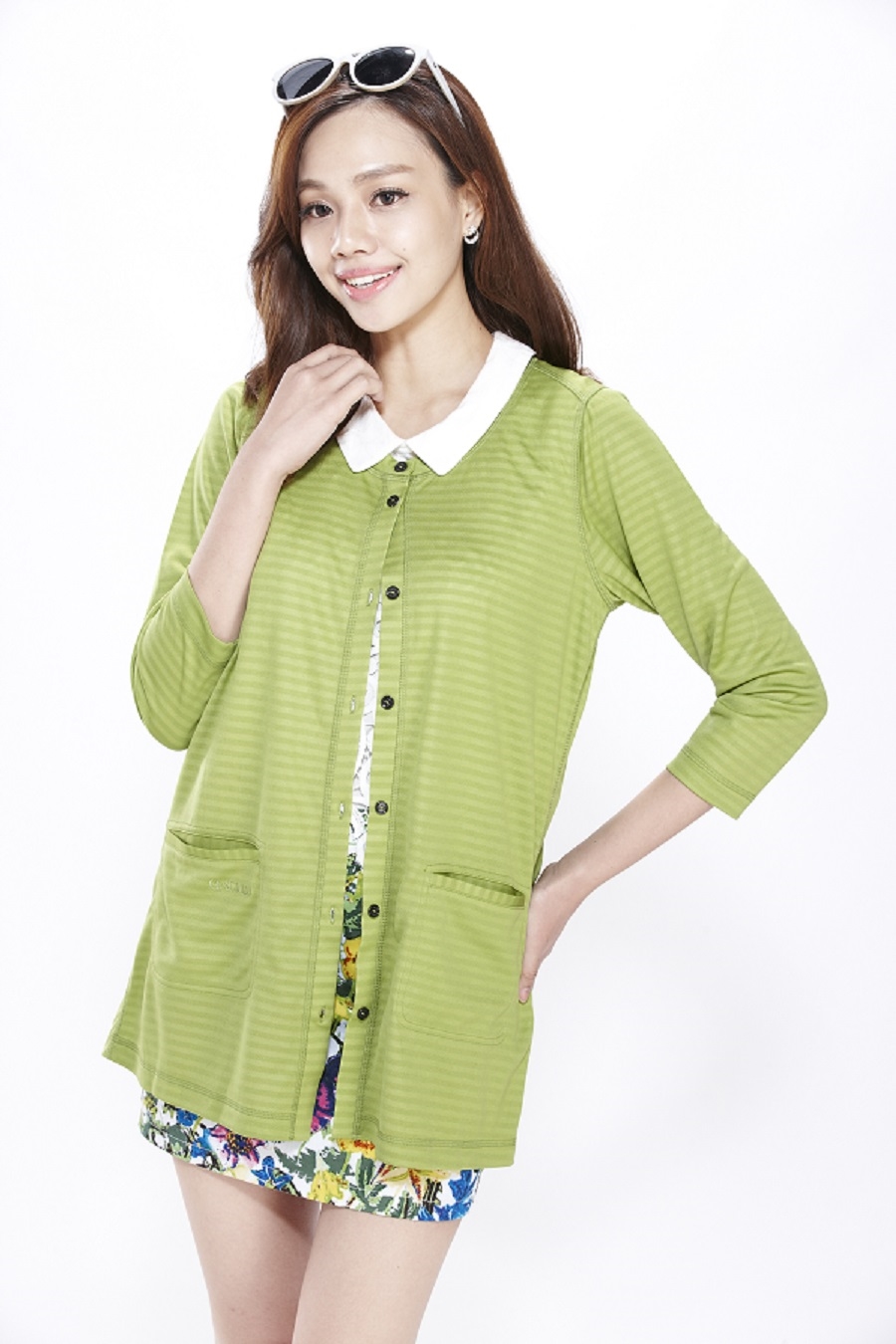 釦子採用精品貝殼釦,黑色鋼琴烤漆,增加精緻感。反面為橫條紋設計,採陽離子染整法,格紋間格線細緻平均更具質感,讓您一次擁有不同樣式,可多變穿搭。