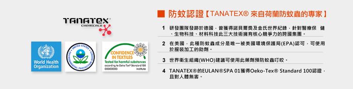 1. 抗蚊蟲: 此組外套之布料具有抗蚊蟲功能,是模擬菊花類植物中可抗蚊蟲之物質所製成。