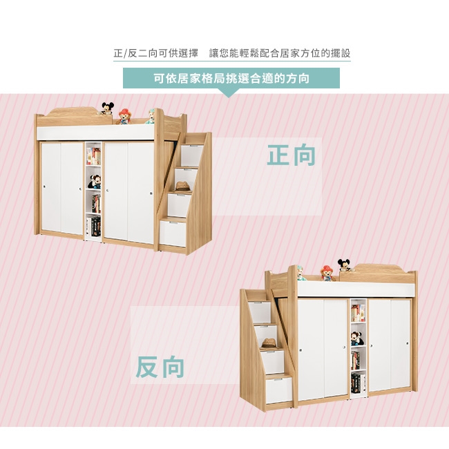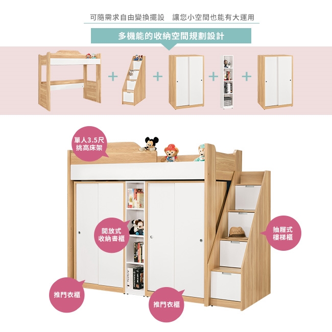挑高床架+樓梯櫃+開放式格層+吊衣桿衣櫃,創造生活大空間!