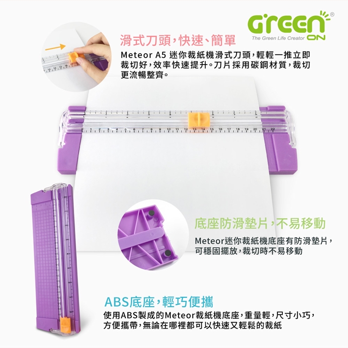 Meteor A5 迷你裁紙機滑式刀頭,輕輕一推立即裁切好,效率快速提升。刀片採用碳鋼材質,裁切更流暢整齊。