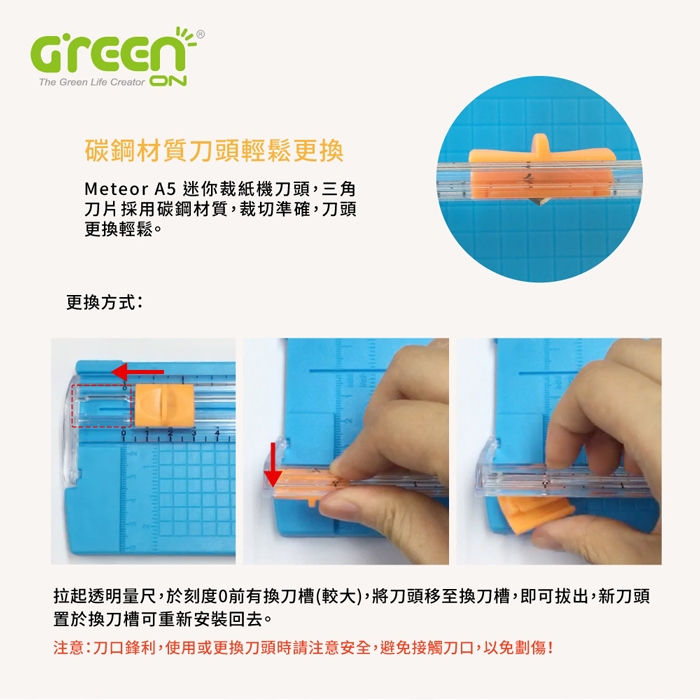 Meteor A5 迷你裁紙機刀頭,三角刀片採用碳鋼材質,裁切準確,刀頭更換輕鬆。