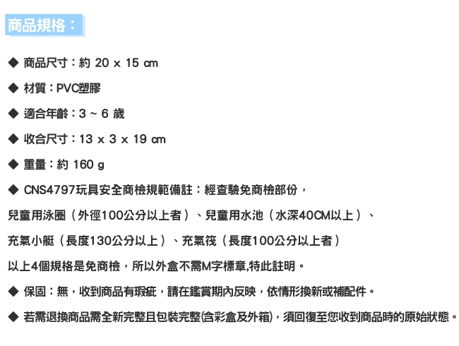 使用前請參考說明書。適合3~6歲孩童,兒童戲水時,務必要有大人陪同,隨時注意安全。