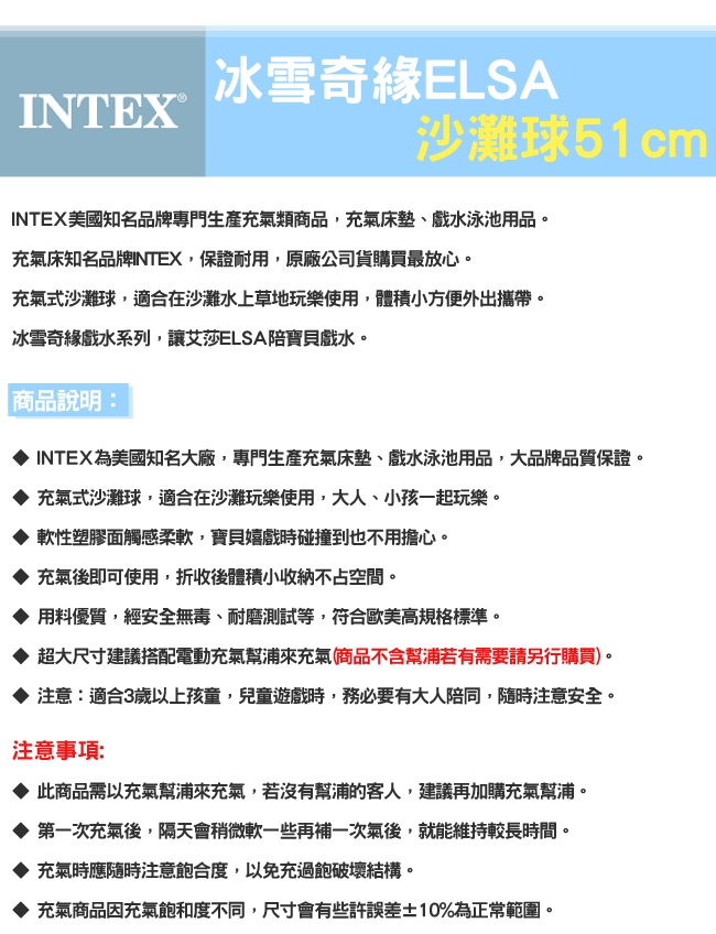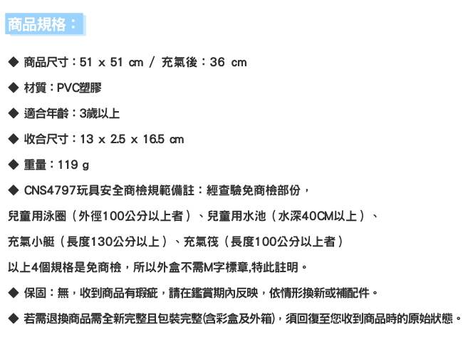 ◆ 充氣商品因充氣飽和度不同,尺寸會有些許誤差±10%為正常範圍。