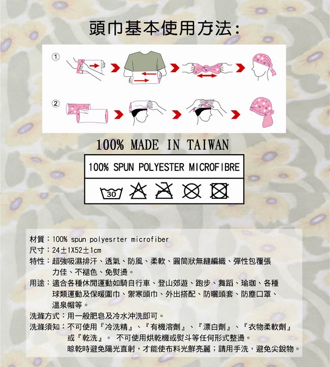 洗滌方式:用一般肥皂及冷水沖洗即可