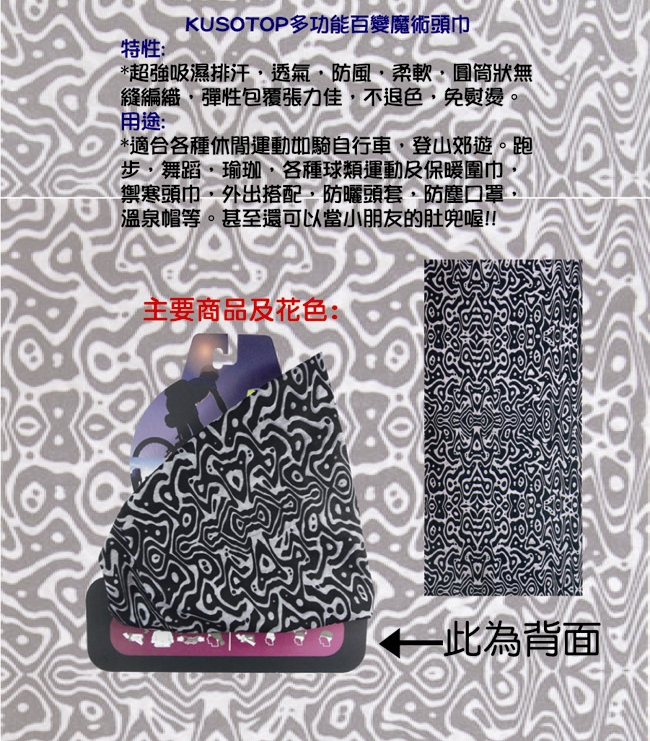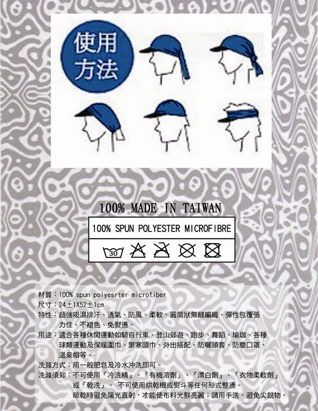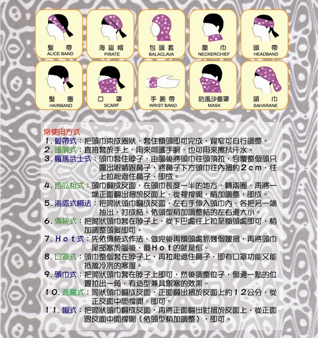 *適合各種休閒運動如騎自行車, 登山郊遊. 跑步, 舞蹈, 瑜珈, 各種球類運動及保暖圍巾, 禦寒頭巾, 外出搭配, 防曬頭套, 防塵口罩, 溫泉帽等. 甚至還可以當小朋友的肚兜喔!!
