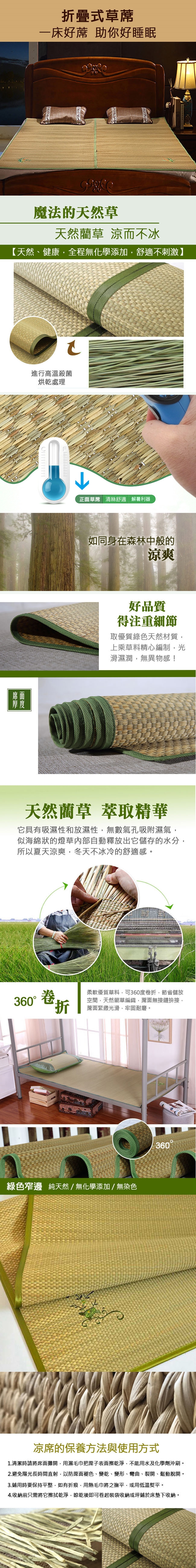 材質取自天然藺草製成,擁有清涼、清香、透氣、散熱的特性,製作過程完全不使用任何化學藥劑及添加物,天然有保證。