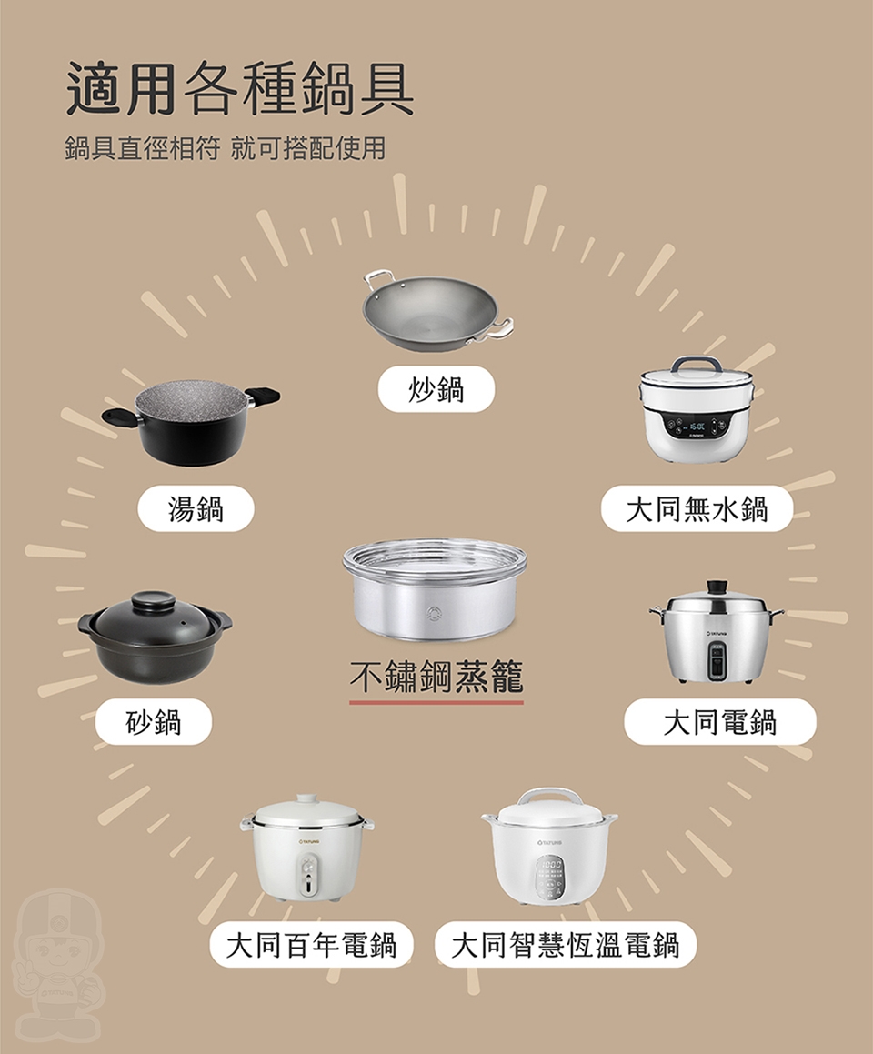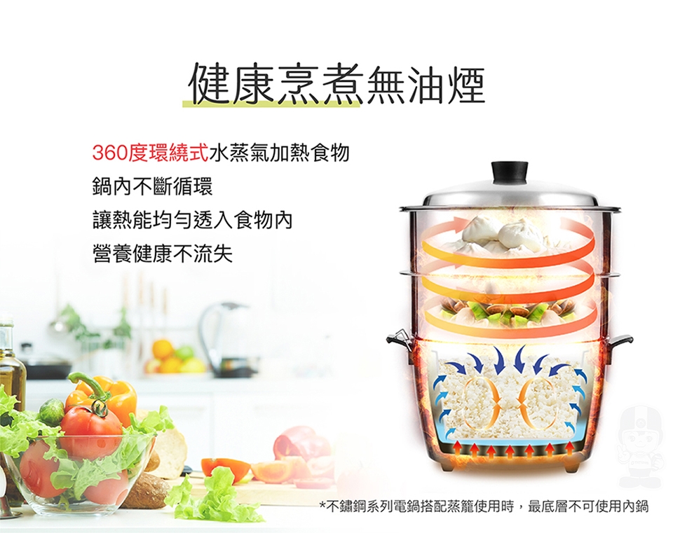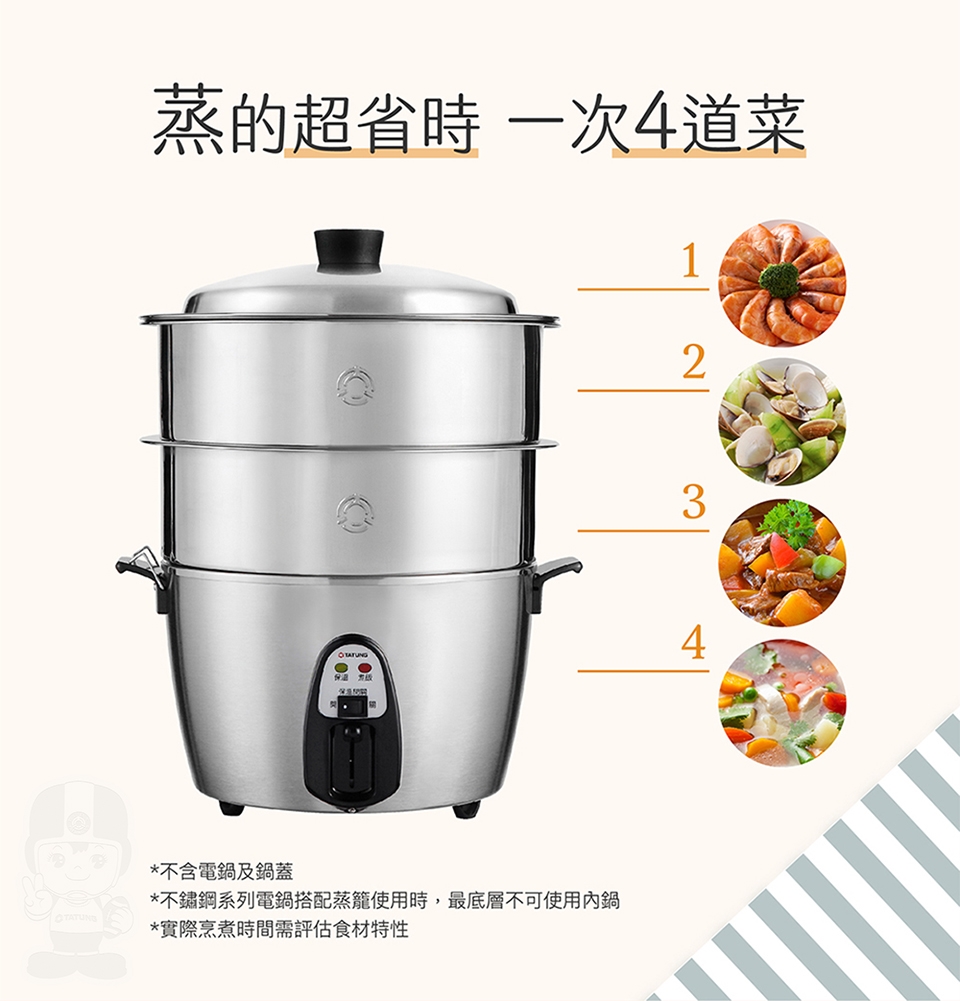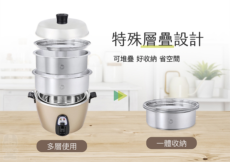 蒸籠與內鍋可同時蒸煮及燉滷食物(適用鋁外鍋機種,不鏽鋼機種使用時請勿與內鍋搭配使用)