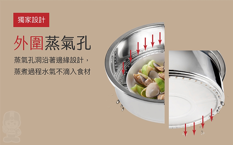 蒸氣孔位於最外圍,水氣凝結不會滴到食物,蒸煮食物營養不流失,美味又可口