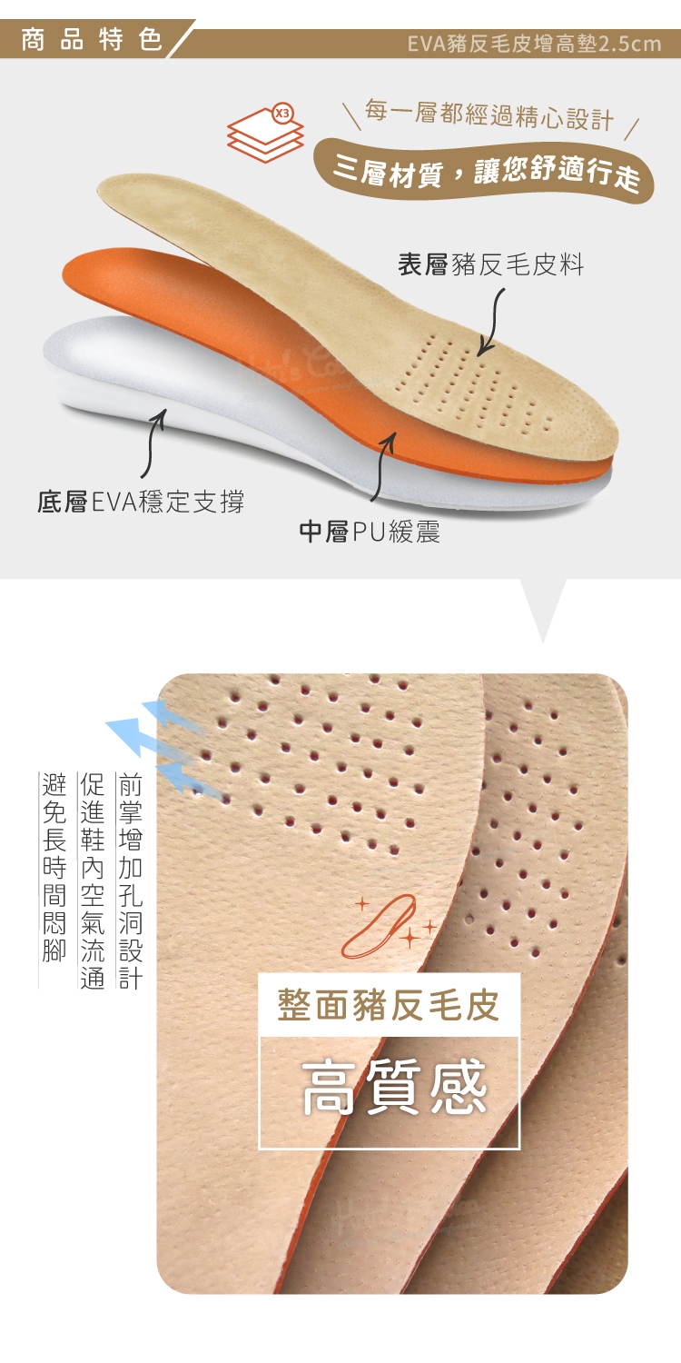 豬皮鞋墊吸濕能力強,有助於保持腳部乾爽,防止穿鞋產生異味!