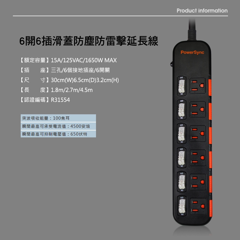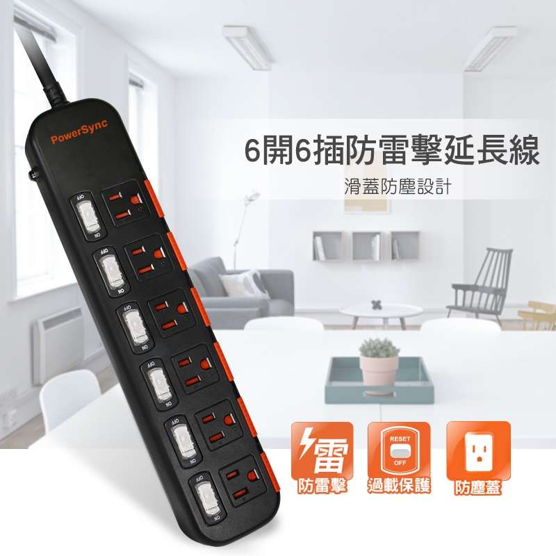 ● 品名:6開6插滑蓋防塵防雷擊延長線