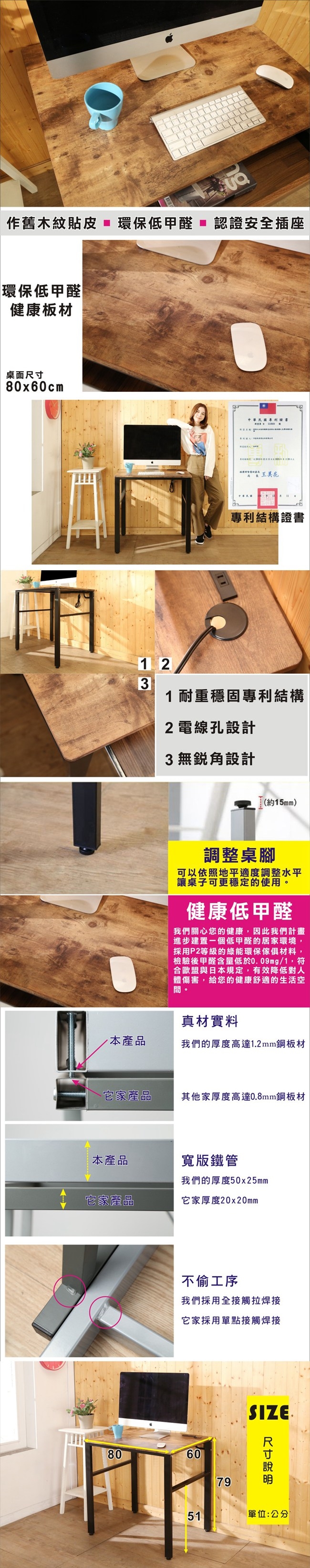 寬80公分桌面設計,大小適中,桌角安全無銳角,使用空間更安全,擺放電腦後,還有桌面空間可供閱讀、寫作使用,桌子下也有空間可隨意收納擺放電腦主機等等,空間隨你需求輕鬆變。桌面板材質使用P2等級木板,讓消費者遠離甲醛,外型巧妙將自然與工業風鐵管元素結合,沒有突兀的不協調感,反而創造出空間的活力自信!此外,更搭配同款公文櫃,二抽屜可放置書本、文件資料等物品。公文櫃也附有插座,方便小電器或手機充電使用。櫃子底下附有腳墊及輪子兩款配備,可依需求安裝。實品超精緻,質感極佳,使用超方便,真的非常的推薦哦!