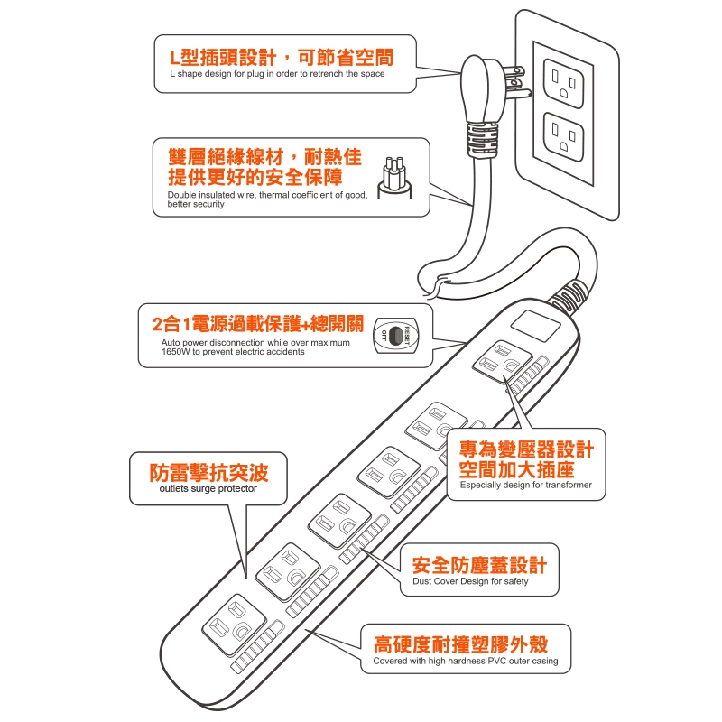 ※本產品為室內使用,請勿置於潮濕空間或於戶外使用並遠離火源或高溫環境下使用。※請勿自行拆解產品可能導致功能無法正常運作。※請注意開封避免包材刮手。※ 檢查本產品時,請移除所有插頭。※含有過載保護功能,過載使用時會斷電。※本產品已投保新台幣一千萬產品責任險。※請詳閱包裝上說明後購買,拆封恕不退換!※本產品限台灣地區使用(For Taiwan use only)