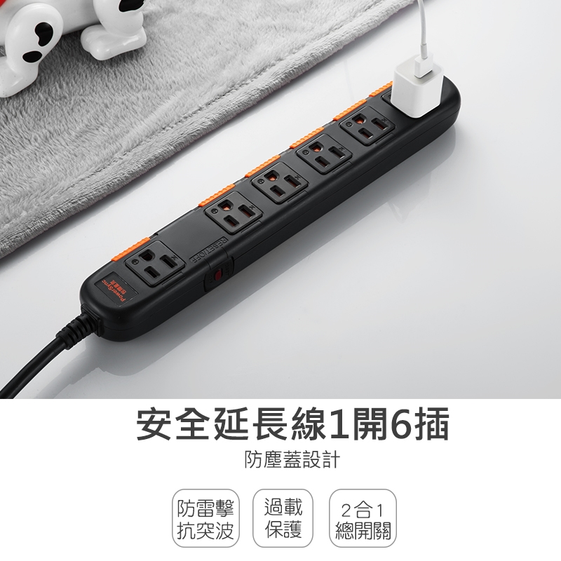 ● 品名:1開6插安全防雷防塵延長線