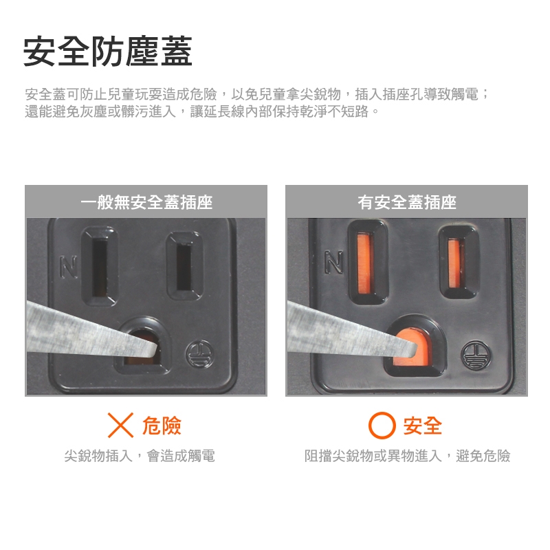 ‧ 防塵蓋可避免孩童觸摸插孔及防止灰塵進入