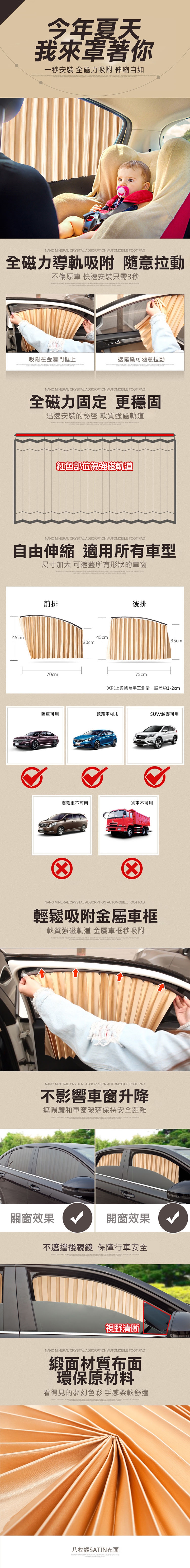 1.適用於大部分車型,磁吸軌道可根據窗框大小和喜好自由裁剪,裁剪後請記得將兩側卡扣軌道帽裝回,避免窗簾掛勾脫落。(注意:本產品一經裁剪後無法辦理退換貨,謝謝。)