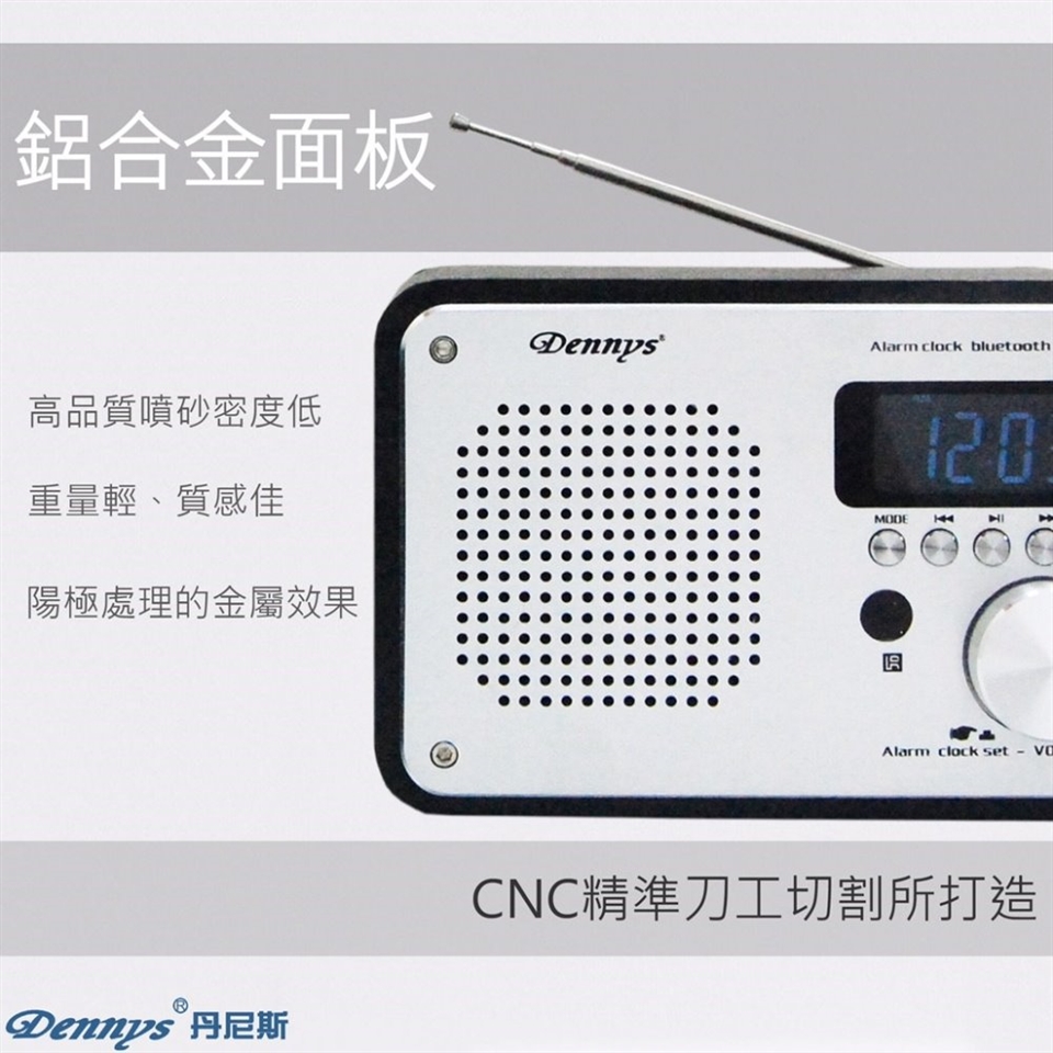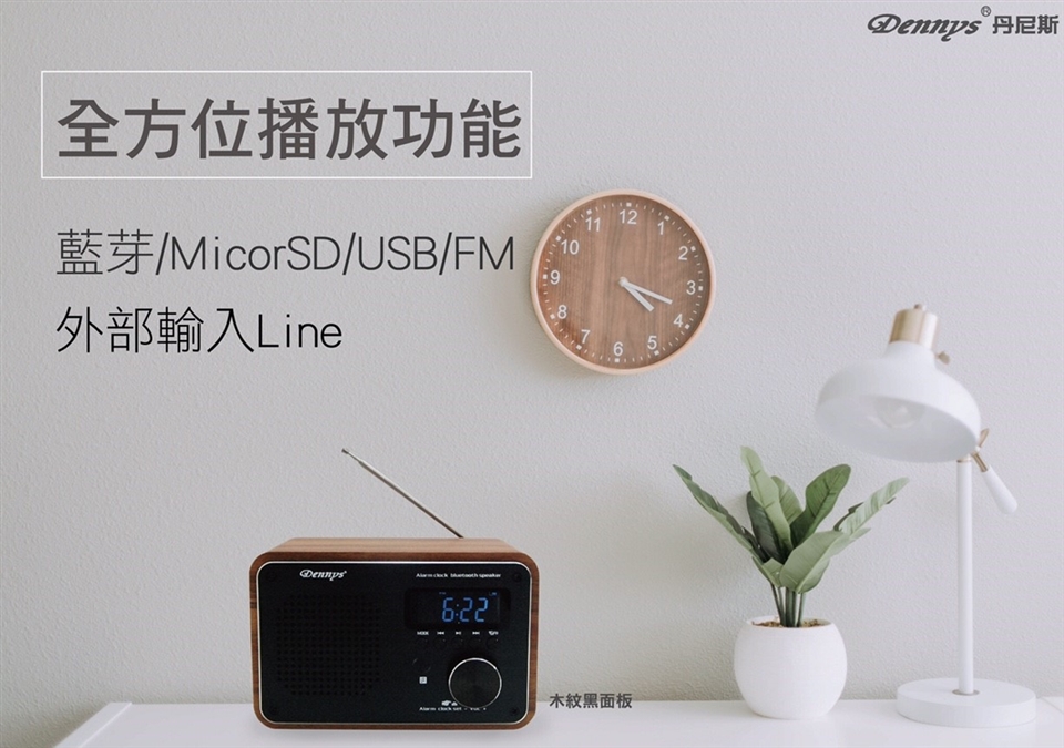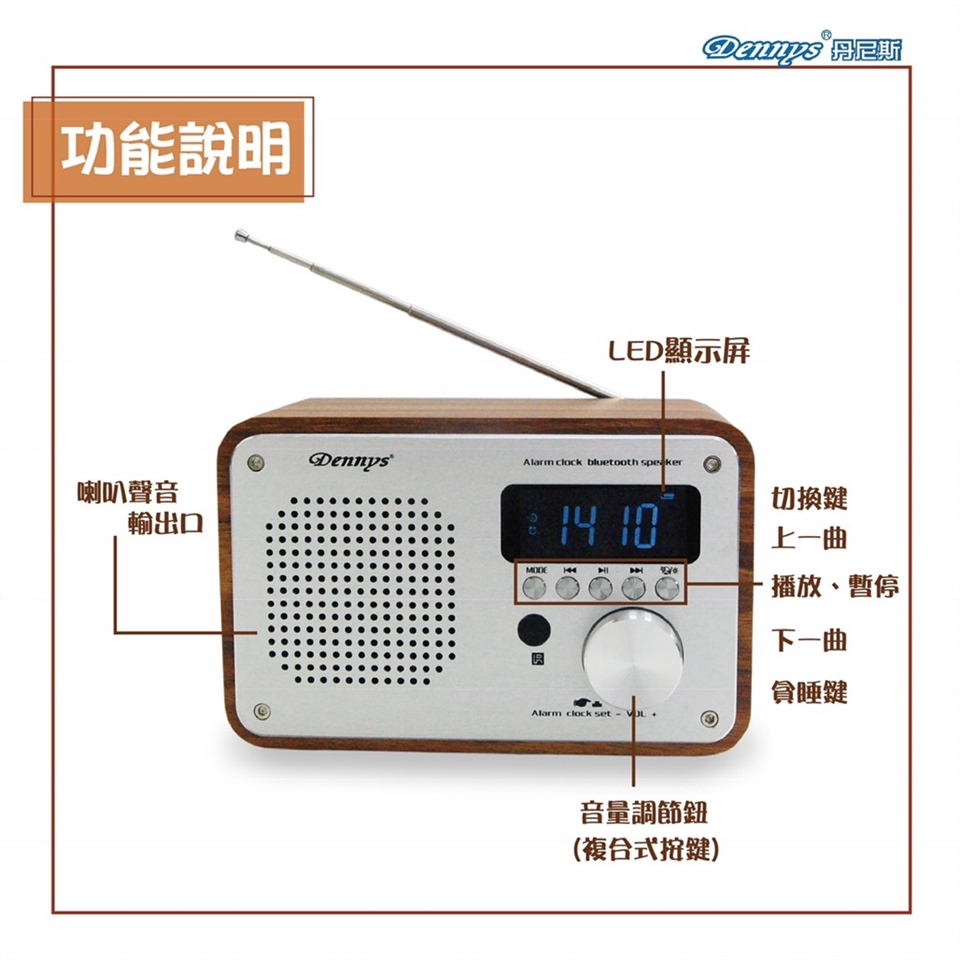 用電台音樂或鬧鈴聲喚醒您。只要在您的Dennys無線音樂鬧鐘上設定鬧鐘,即可選擇用MP3音樂或廣播電台當鬧鐘。到了設定的時間,Dennys木質無線音樂鬧鐘就會自動播放MP3音樂或廣播電台。