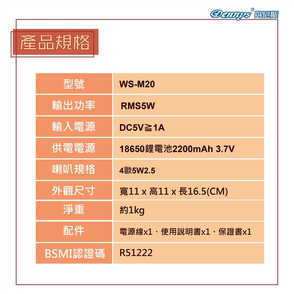 ‧電源:DC(5V 1000mA)USB充電、18650充電式2200mAh鋰電池