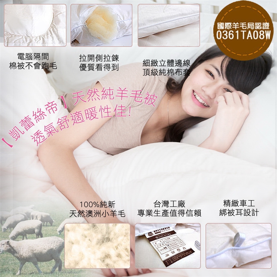 【凱蕾絲帝】精選通過國際澳洲羊毛局檢驗合格之台灣工廠,製造出適合台灣溫度與國人睡眠特性之頂級羊毛被,以最直接、最經濟之價格提供給國人貨真價實之優質好被!