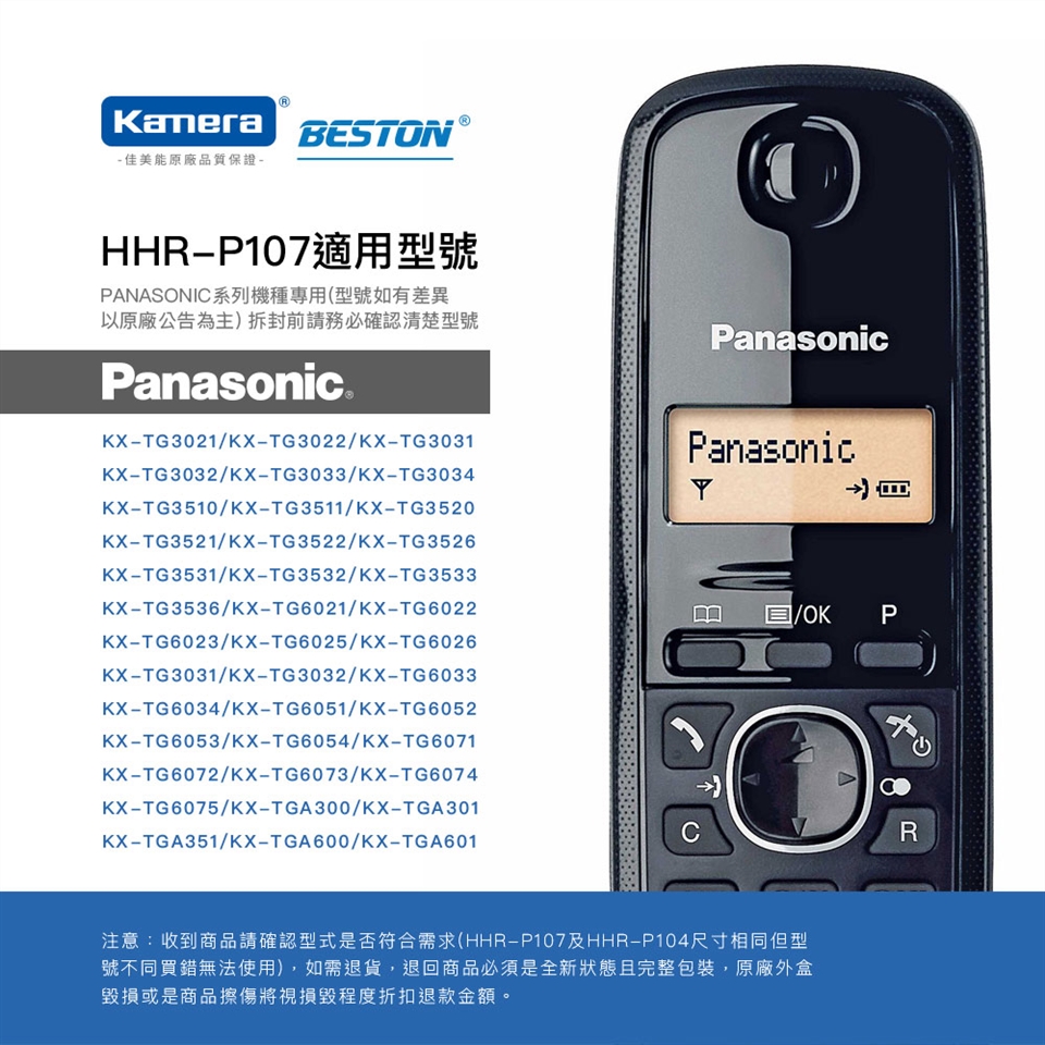 品牌:BESTONbr/品名:無線電話電池br/型號:HHR-P107br/電壓:3.6Vbr/容量:850mAhbr/適用機型:BB-GT1500,BB-GT1502,BB-GT1520,BB-GT1522,BB-GT1540,br/BB-GTA150,KX-TG20,KX-TG30,KX-TG3021,KX-TG3022.,KX-TG3024,KX-TG3031,KX-TG3032,KX-TG3033,KX-TG3034,KX-TG3510,KX-TG3511,KX-TG3520,KX-TG3521,KX-TG3522,KX-TG3526,KX-TG3531,KX-TG3532,KX-TG3533,KX-TG3536,KX-TG6021,KX-TG6022,KX-TG6023,KX-TG6025,KX-TG6026,KX-TG6031,KX-TG6032,KX-TG6033,KX-TG6034,KX-TG6051,KX-TG6052,KX-TG6053,KX-TG6054,KX-TG6071,KX-TG6072,KX-TG6073,KX-TG6074,KX-TG6075,KX-TGA21,KX-TGA300,KX-TGA301,KX-TGA351,KX-TGA600,KX-TGA601br/包裝尺寸:133 x 98 x 20 mmbr/毛重:52gbr/產地:中國br/保固:6個月/產品故障(非人為)