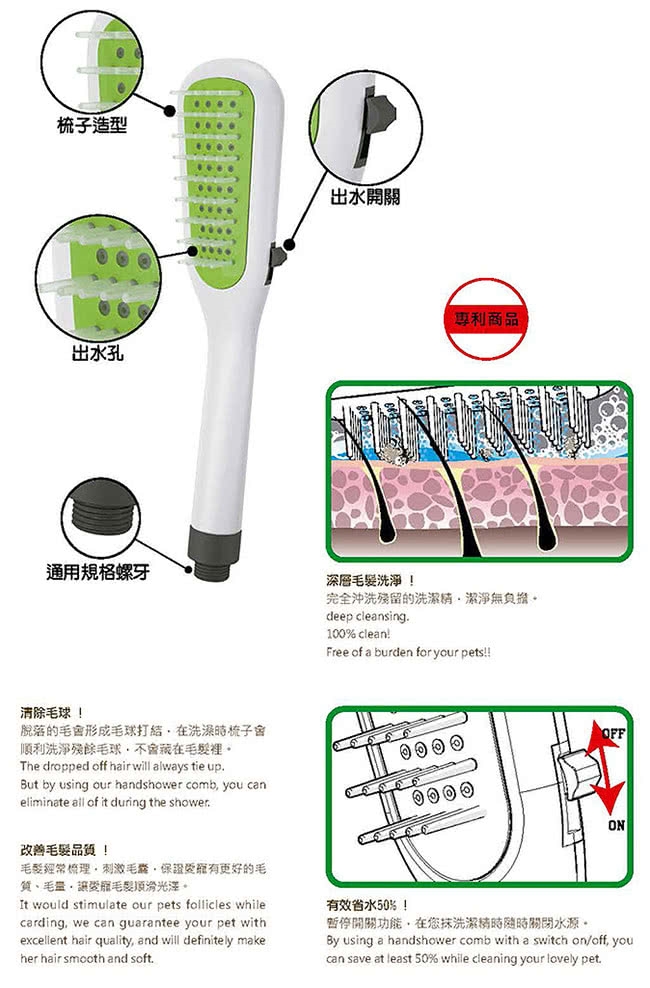 .增添梳齒功能能快速幫寵物清洗,梳開毛髮打結處、給予舒服按摩。