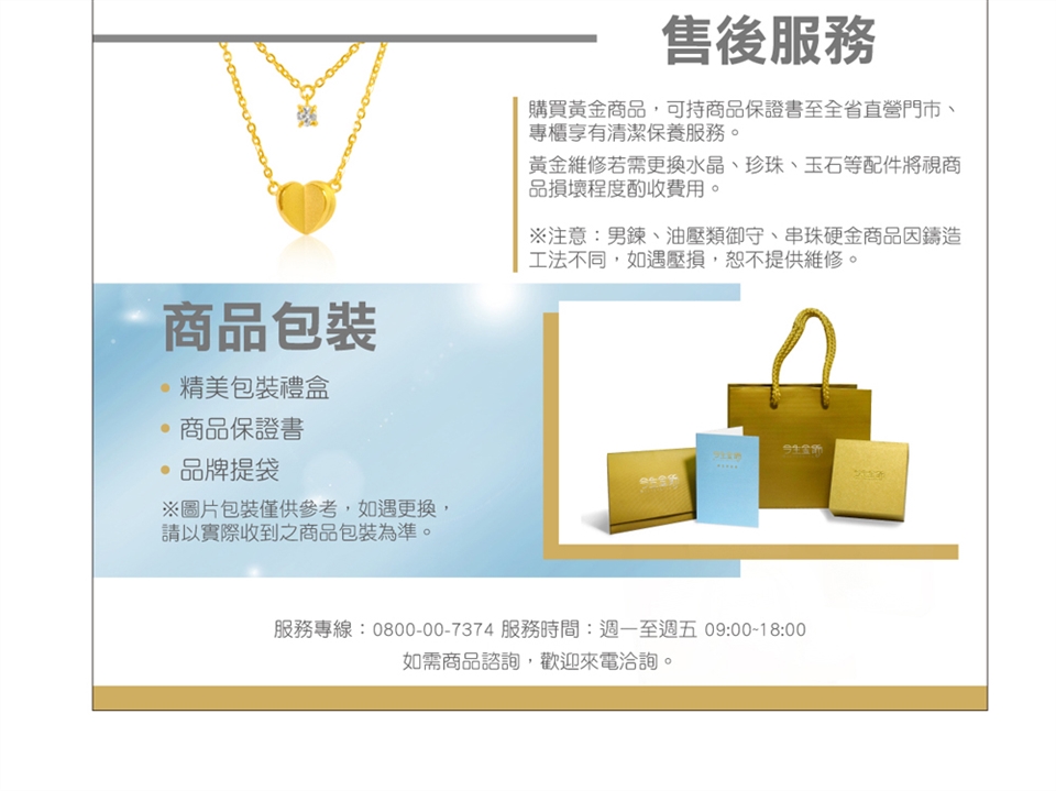 黃金具有延展、可塑性高的材質,如:做家事、游泳、泡溫泉等休閒活動,建議先取下,待活動結束時再配戴,以維持商品狀態。