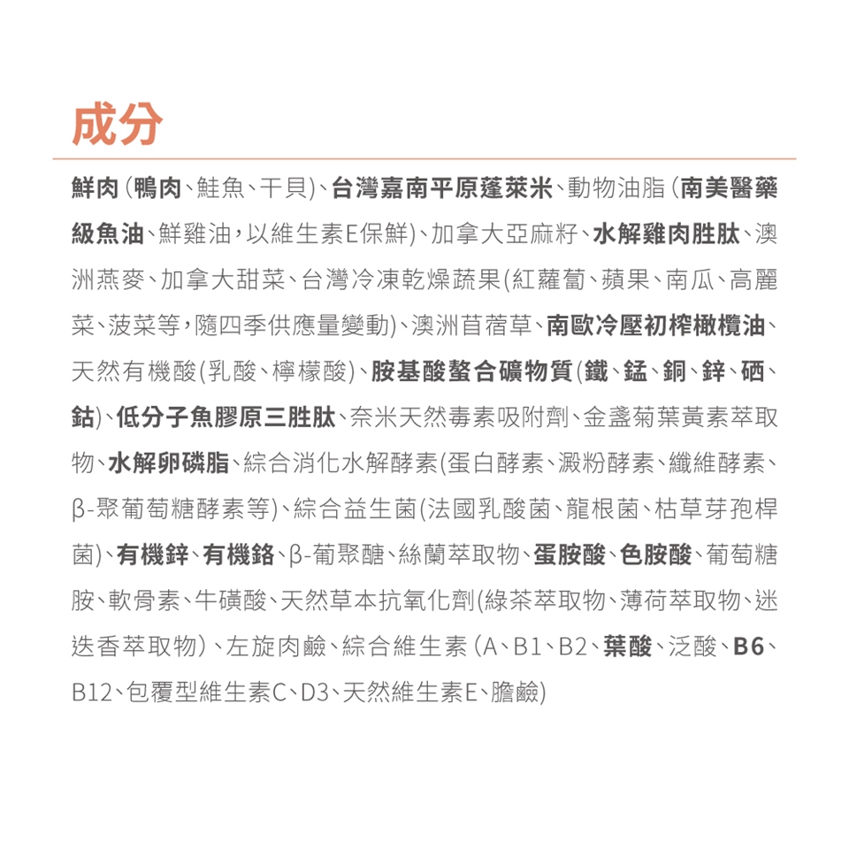 商品詳細介紹 體驗說明 不可體驗 使用方法說明 由於個體消化能力及活動量差異,請參考包裝側邊之狗狗體重對應給食量,並定期追蹤體重變化微調份量。 注意事項 保存期限18個月,本產品使用天然植物性抗氧化劑,每次使用後請關緊夾鏈,並於開封45天內使用完畢。
