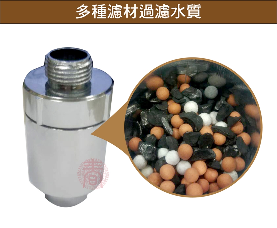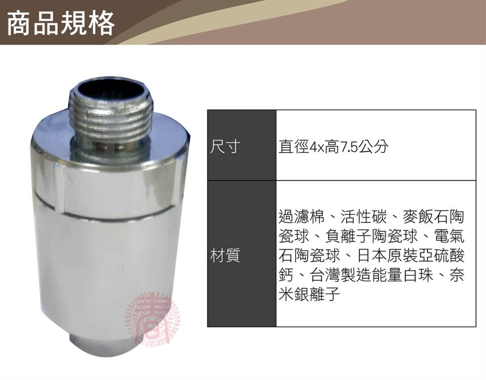 安裝規格:過濾器上方進水口為通用標準四分內牙, 下方出水口為四分外牙 適用各種蓮蓬頭軟管