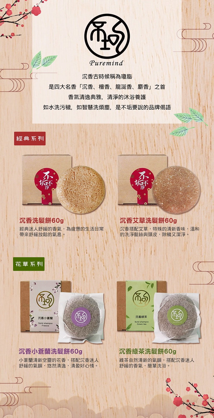 不垢的沉香系列商品中,每一顆皂和髮餅均添加沉香細脂粉,香氣清逸典雅,清淨的沐浴養護。