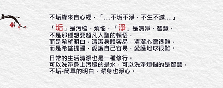 如水洗污穢,如智慧洗煩塵,是不垢要說的品牌偈語。