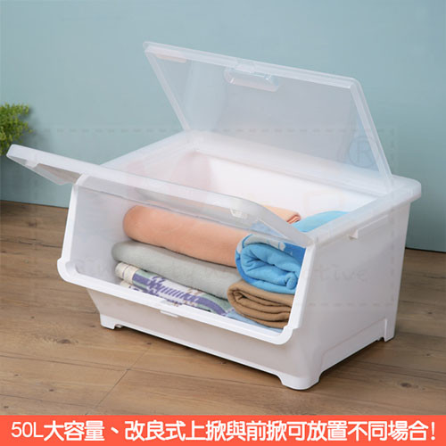 季節交換衣物收藏很煩惱~市面收納櫃樣式太多,卻都不符合您要的!現在推薦這款貼心設《真心良品》春日雙開直取式整理箱(50L),可放置大量的日常用品、衣服、雜物等,除了貼心透明上蓋可以清楚分類收納然省去了找尋物品時的種種不便,加上改良直取式設計不會浪費一絲空間容量更大,讓散亂一地的雜物、玩具、衣物等通通搞定;雪白本體不但容易搭配居家空間,本收納櫃體採用高級塑膠原料,堅固軔性高,更耐用,附滑輪設計移動自如,改良掀蓋設計即使堆疊收納也不需翻箱倒櫃,顛覆傳統收納箱不便之缺點,讓您收納方式大躍進。不管是客廳、廚房、衣櫃、臥室及浴室等各種空間都能隨意搭配使用,這麼貼心的收納利器,您還在等什麼快快帶回家吧!