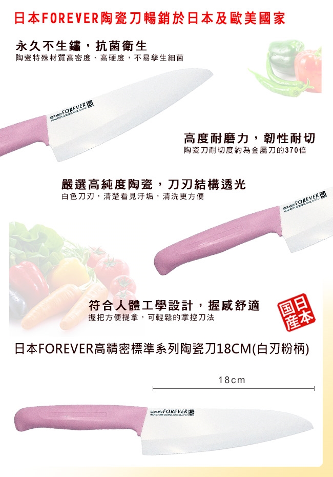 商品名稱:【FOREVER】日本製造鋒愛華高精密標準系列陶瓷刀18CM(白刃粉柄)