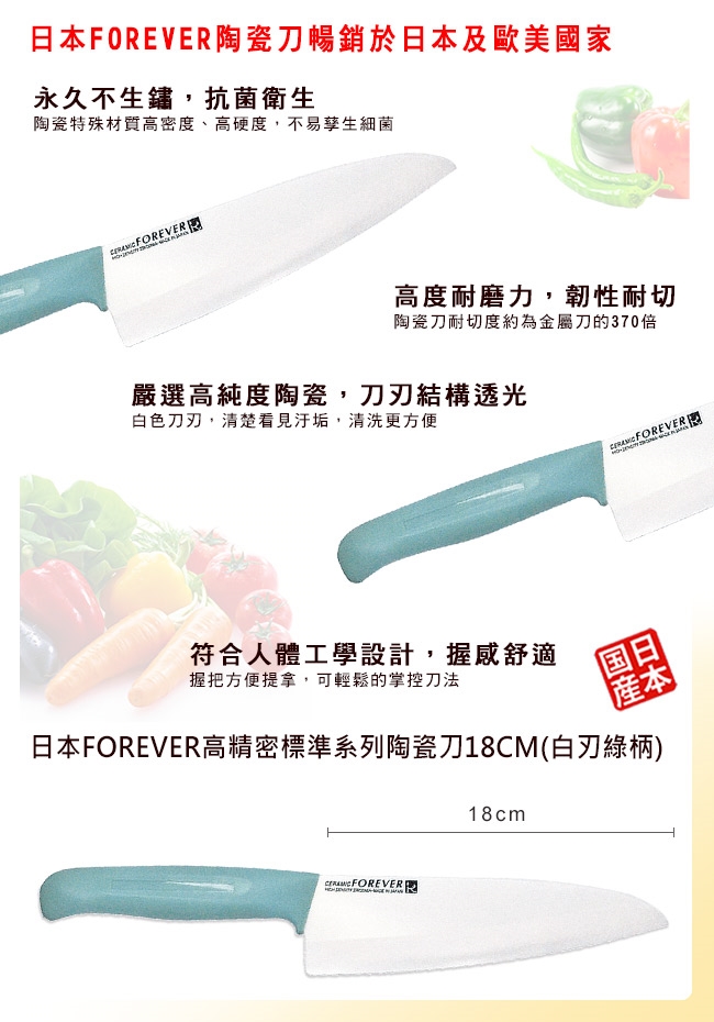 商品名稱:【FOREVER】日本製造鋒愛華高精密標準系列陶瓷刀18CM(白刃綠柄)