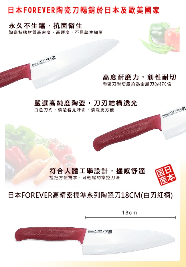 商品名稱:【FOREVER】日本製造鋒愛華高精密標準系列陶瓷刀18CM(白刃紅柄)