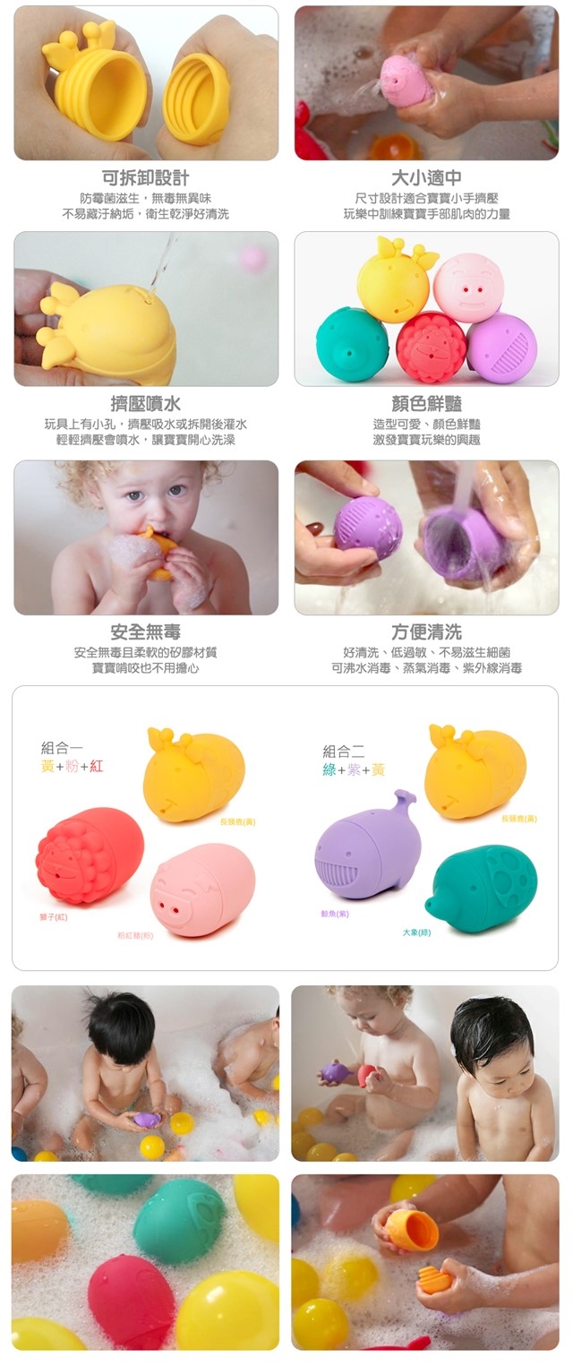 ●可拆卸式清潔設計,不同於一般洗澡玩具由於密封導致發霉發臭等等不衛生的問題,可用高溫消毒後放在通風處可自然風乾。