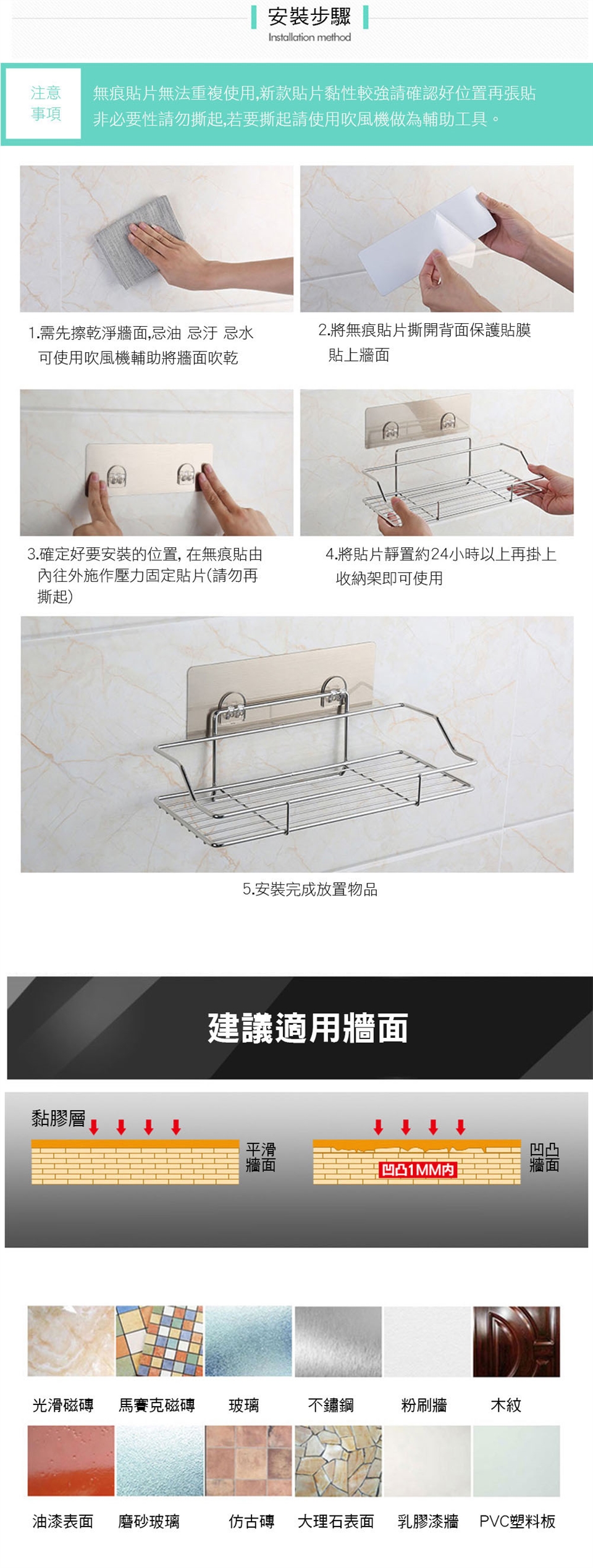 適用牆面:玻璃面、平面光滑、凹凸1~3mm牆面、磁磚面、大理石、馬賽克磁磚、油漆面、磨砂玻璃、不鏽鋼、木紋、仿古磚、乳膝漆牆面、PVC塑料