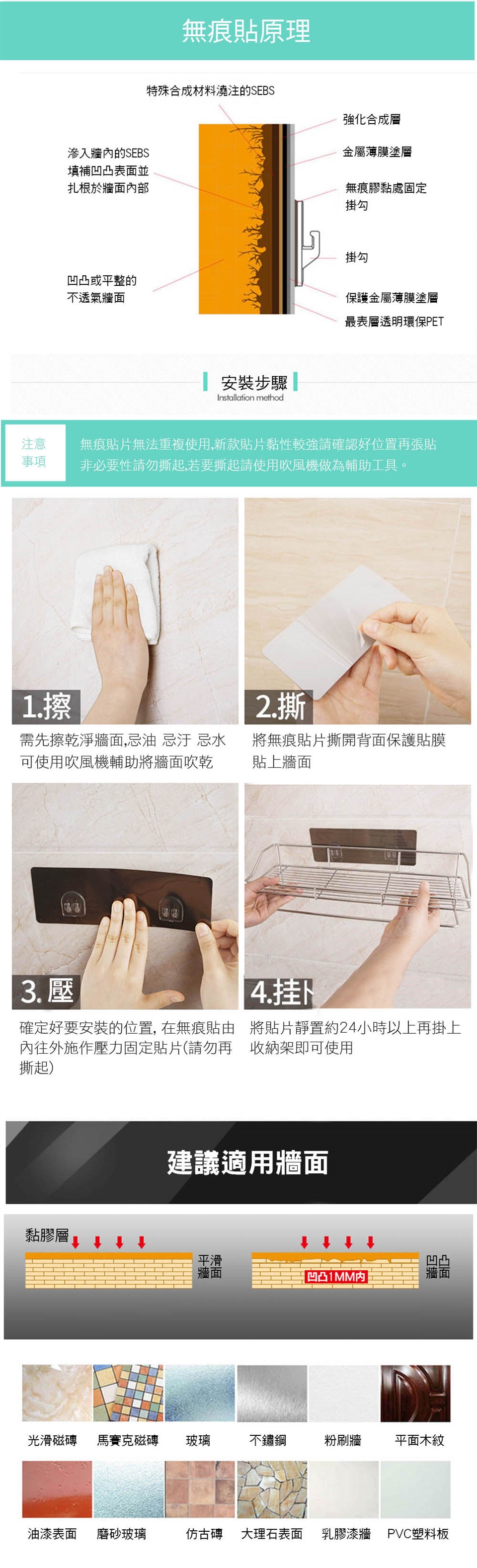 使用功能:無痕貼片無法重複使用,貼片黏性較強請確認好位置再張貼,非必要性請勿撕起若要撕起請使用吹風機做為輔助工具。