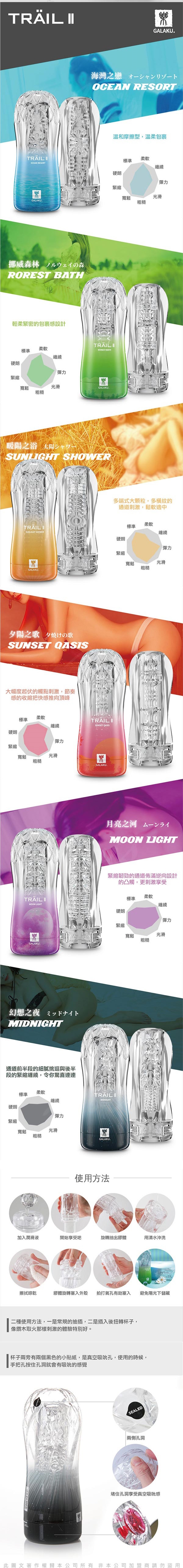 TRAIL II 自慰訓練器體驗1~6階帶您通往快感天堂的飛機杯,全採用透明膠體更柔軟更安全,並且可重覆使用方便清洗!採真空吸吮真實還原如少女般的肉感通道與紋理其中海灣藍、森林綠為柔軟型,柔軟的材質代給您溫和快感;暖陽黃與夕陽紅為標準型柔軟緊實的感覺帶來強烈快感;而月亮紫和幻想黑為刺激型緊實韌勁的設計帶給您更刺激的享受。6款獨特設計的通道讓您因為比真實更刺激帶來昇仙快感喔