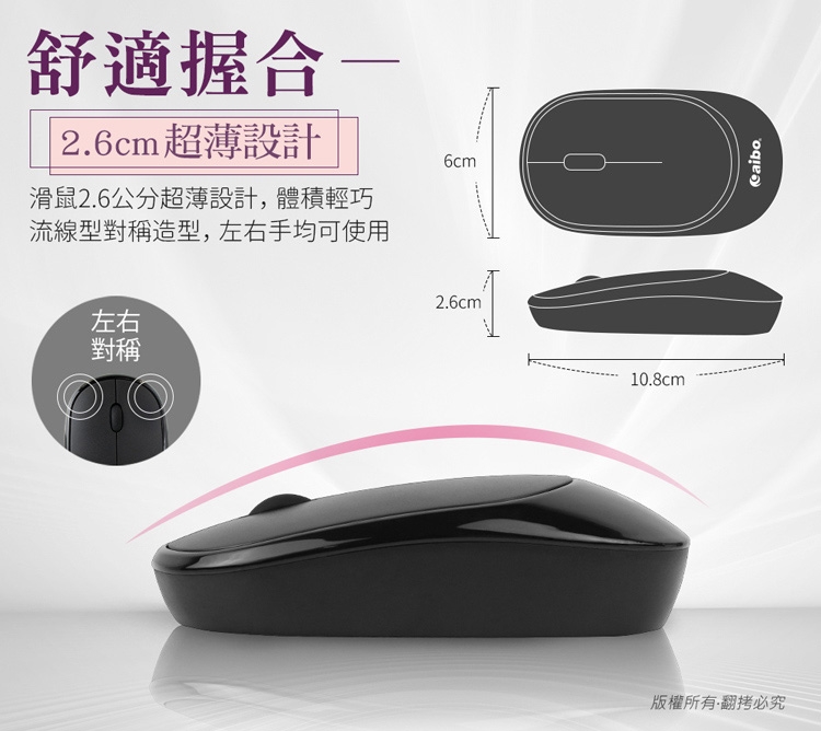 超薄滑鼠設計,2.6cm的體積輕巧、握感舒適,流線型對稱外觀,