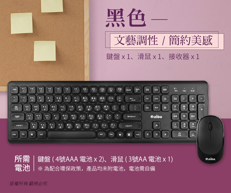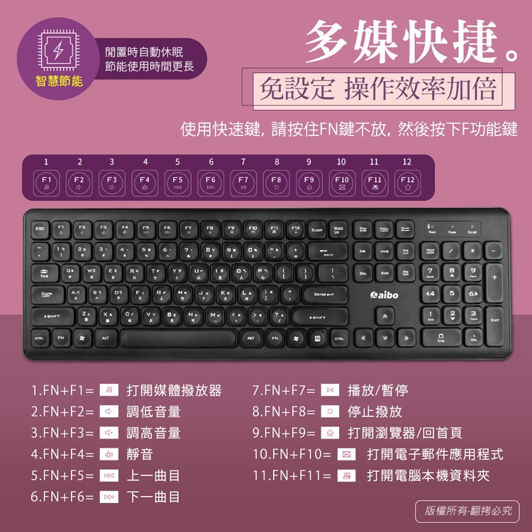 .無線鍵盤、滑鼠採用智慧省電模式,不使用的狀態下會自動休眠,