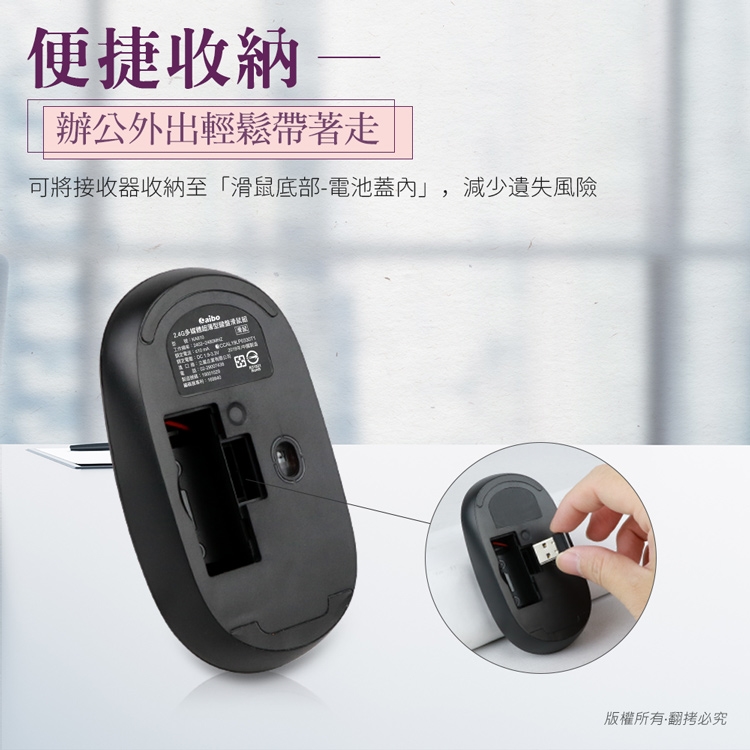 可將接收器收納至「滑鼠底部-電池蓋內」,輕鬆收納帶著走。