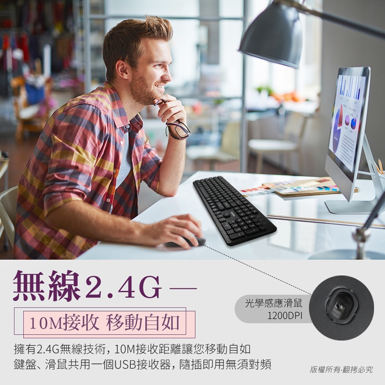 鍵盤、滑鼠共用一個USB接收器,隨插即用無須對頻。