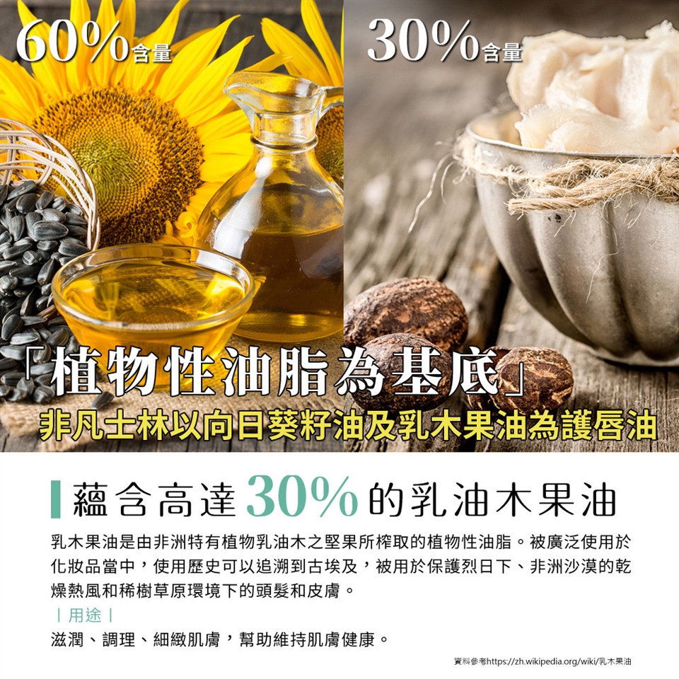 ●以向日葵籽油及乳木果油植物性油脂為基底,其中乳木果油富含高達30%,預防乾裂滋潤雙唇,並添加蜂蠟、荷荷巴油和維生素E多種奢華保養成分,深層滋養修護效果使雙唇更加豐澤。