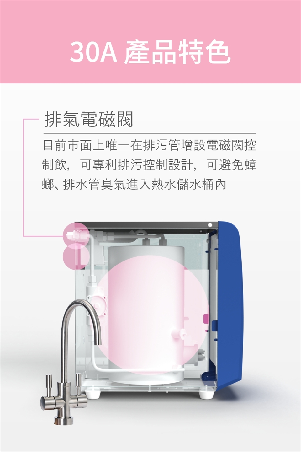 – 溫度偵測 採用日本雙溫度偵測元件,隨時偵測熱水儲存桶內溫度,溫度過高時,自動啟動排氣洩壓。