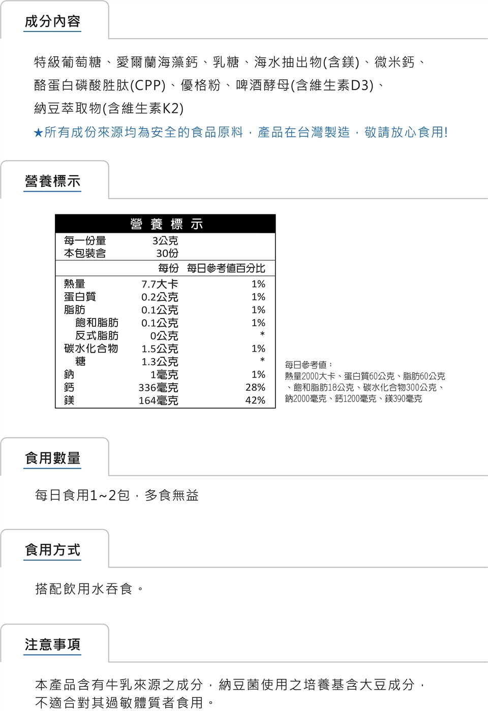 本產品含有牛乳來源之成分,納豆菌使用之培養基含大豆成分 ,不適合對其過敏者食用