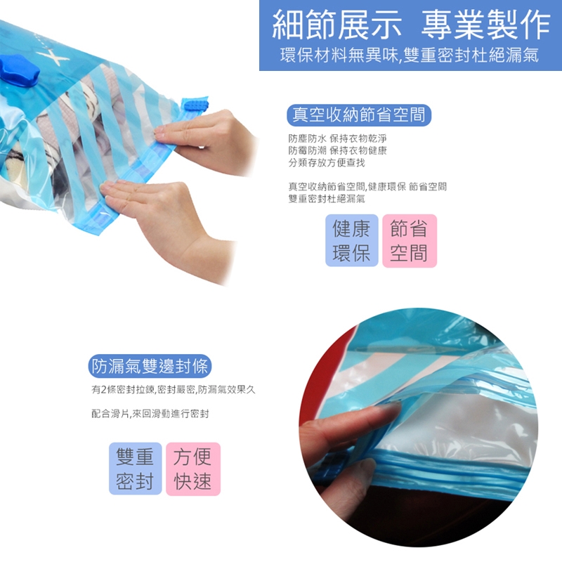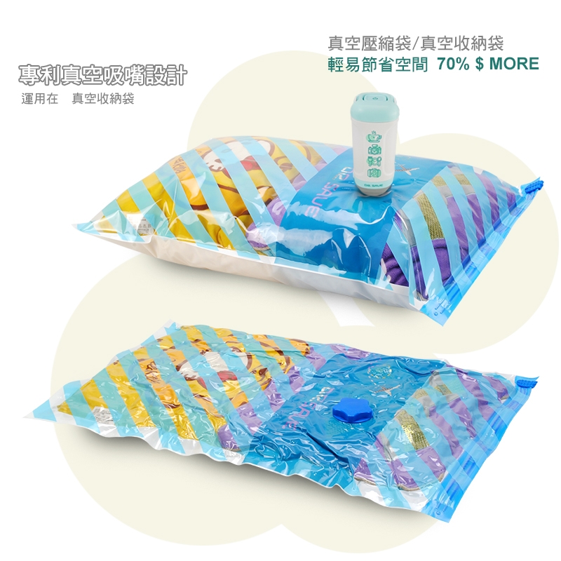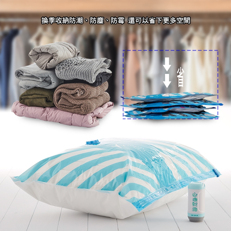 2.抽氣時,用手拍打壓縮袋表面,對抽氣可起輔助效果也可使收納物平整,容易堆疊。