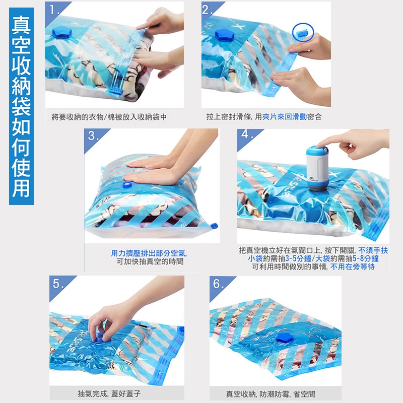 7.大件物品切勿強行放入,請選用相應規格的壓縮袋。