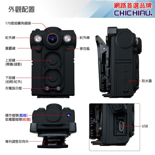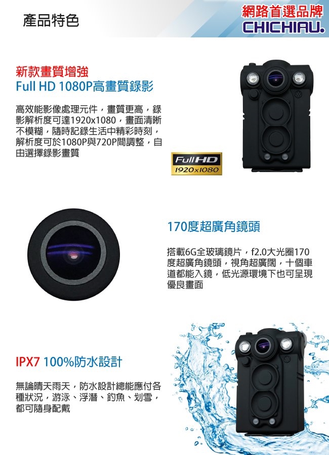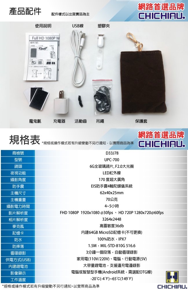 【CHICHIAU】HD 1080P 超廣角170度防水紅外線隨身微型密錄器(64G) UPC-756F |