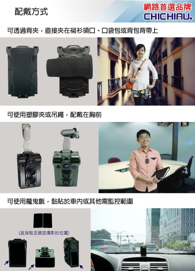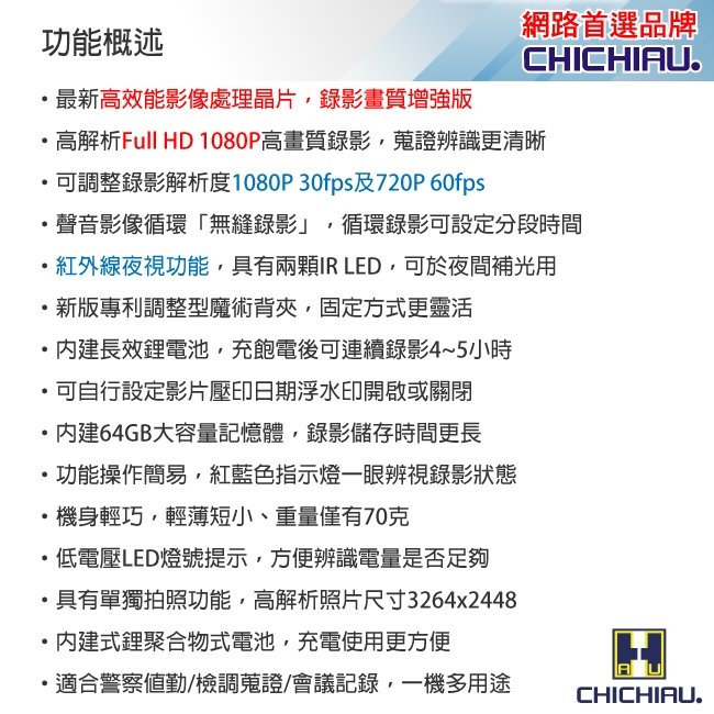 【CHICHIAU】HD 1080P 超廣角170度防水紅外線隨身微型密錄器(64G)為嚴選高顯彩色微型密錄攝影器材,使用最新1080P高清晶片,可自行調整內置參數設定(1080P、720P、錄影時間等...)並帶有2顆紅外線夜視補光增強夜視效果。內建可充式鋰電池、高感度麥克風,可清晰收錄影音,有別一般隨身型同類產品。其傳送圖像速率更高,免除畫面不連續及中斷之困擾,本商品影像辨識度及亮度更高,於低照度環境拍攝也顯得出色,充滿電狀態下錄影時間約4-5小時(依實際使用狀況而定),而撥放時影片可顯示日期及時間,亦可充當行車紀錄器使用。 |