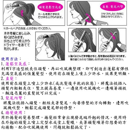 使用前在頭髮上噴上少許水(或洗髮後半乾的狀態),將魔法梳插入頭髮內輕輕夾住,豎立提高卷度,一邊使用吹風機吹一邊順著頭梳,飄逸亮麗的直髮就可以完成。